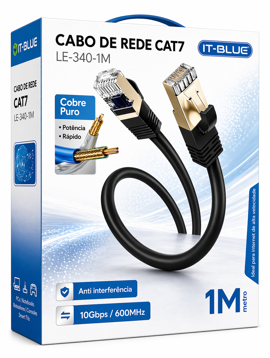Conecte seus dispositivos com alta velocidade e confiabilidade usando o cabo de rede Cat7 IT-Blue de 1 metro. Ideal para quem busca qualidade em transmissões de dados.